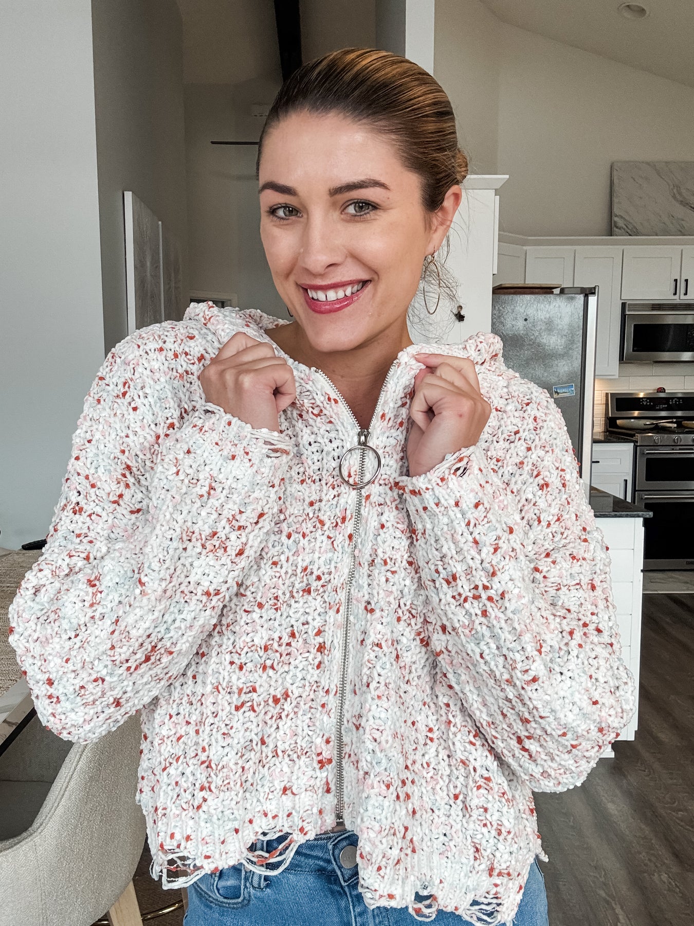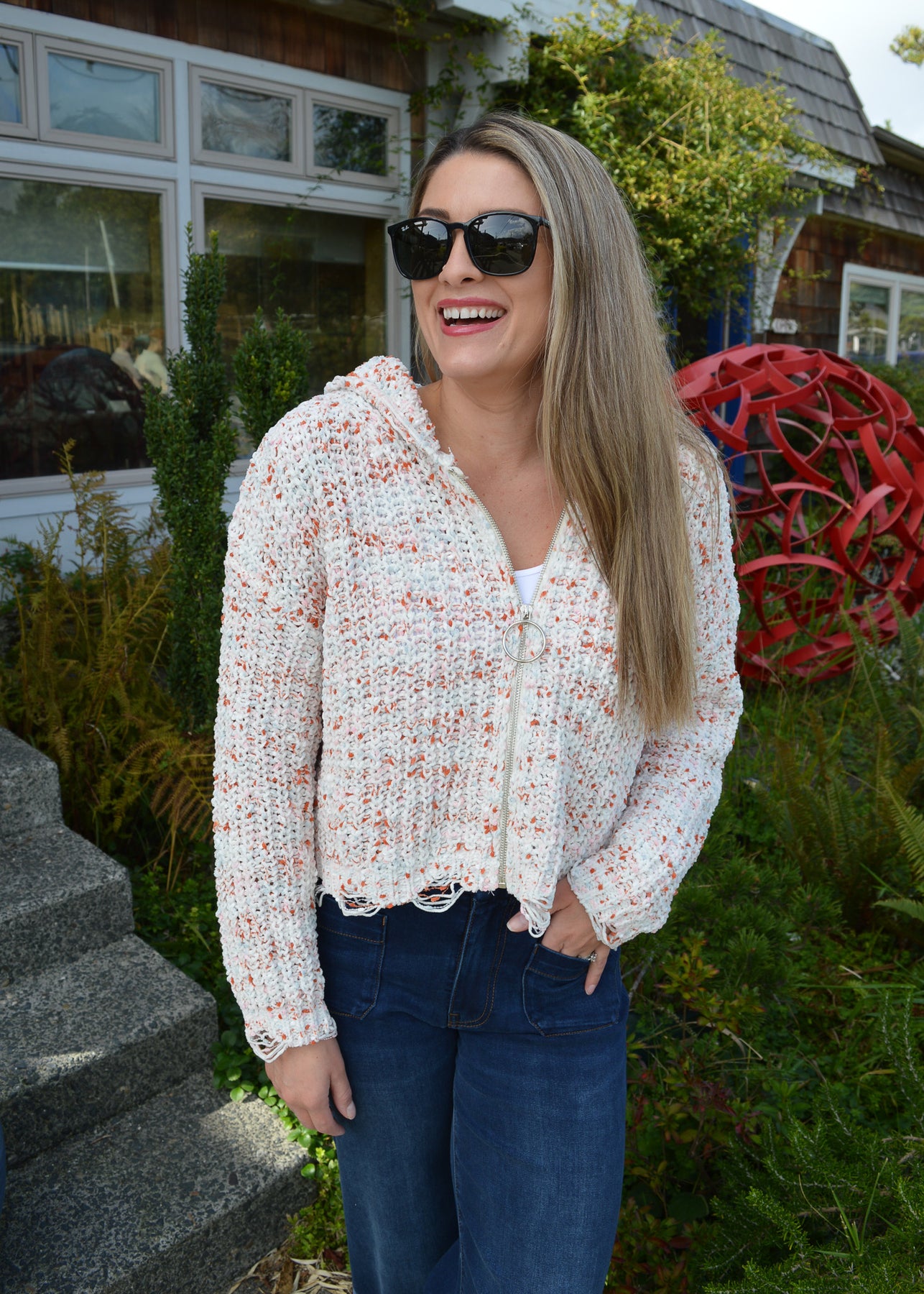 Experience cozy style with the Only You Zip sweater, featuring a two-toned cable knit chenille design and a distressed front zipper for an edgy touch. Made from a soft blend of 55% cotton and 45% acrylic, it offers warmth and comfort perfect for layering in cooler weather. Elevate your wardrobe with this standout piece that combines fashion and function effortlessly.