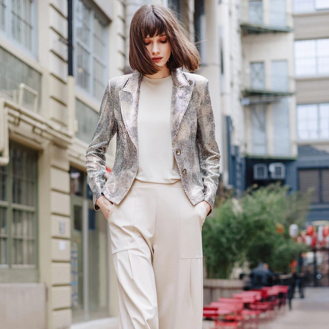 Step into Living The Dream Jacket with this playful, shimmering blazer crafted from a high-quality nylon-sequin blend. Its luxurious texture wraps you in soft comfort while tiny reflective sequins catch the light on a lightly lined jersey knit base. Featuring a single-breasted, 2-button closure, this textured sequin knit adds just the right sparkle to brighten your day or night. Cheers to style with a fun twist!